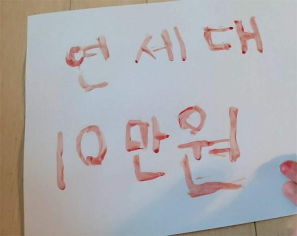 Cùng ngày, trên trang cộng đồng của Đại học Yonsei cũng có bài đăng với hình ảnh thư được viết bằng máu. Nội dung dòng chữ ghi "Đại học Yonsei 100.000 KRW".