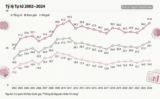 Vấn đề sức khỏe tâm thần đang trở thành một cuộc khủng hoảng nghiêm trọng khi tỷ lệ tự tử tại Hàn Quốc trong năm 2024 đã tăng thêm 1,8 người, đạt mức 29,1 trường hợp trên 100.000 dân. Đây là con số cao nhất trong vòng 13 năm qua, đưa Hàn Quốc giữ vững vị trí "quán quân" về tỷ lệ tự tử trong khối OECD với khoảng cách xa so với quốc gia đứng thứ hai là Slovenia. Trong đó, tỷ lệ tự tử ở nam giới cao gấp hơn hai lần so với nữ giới.